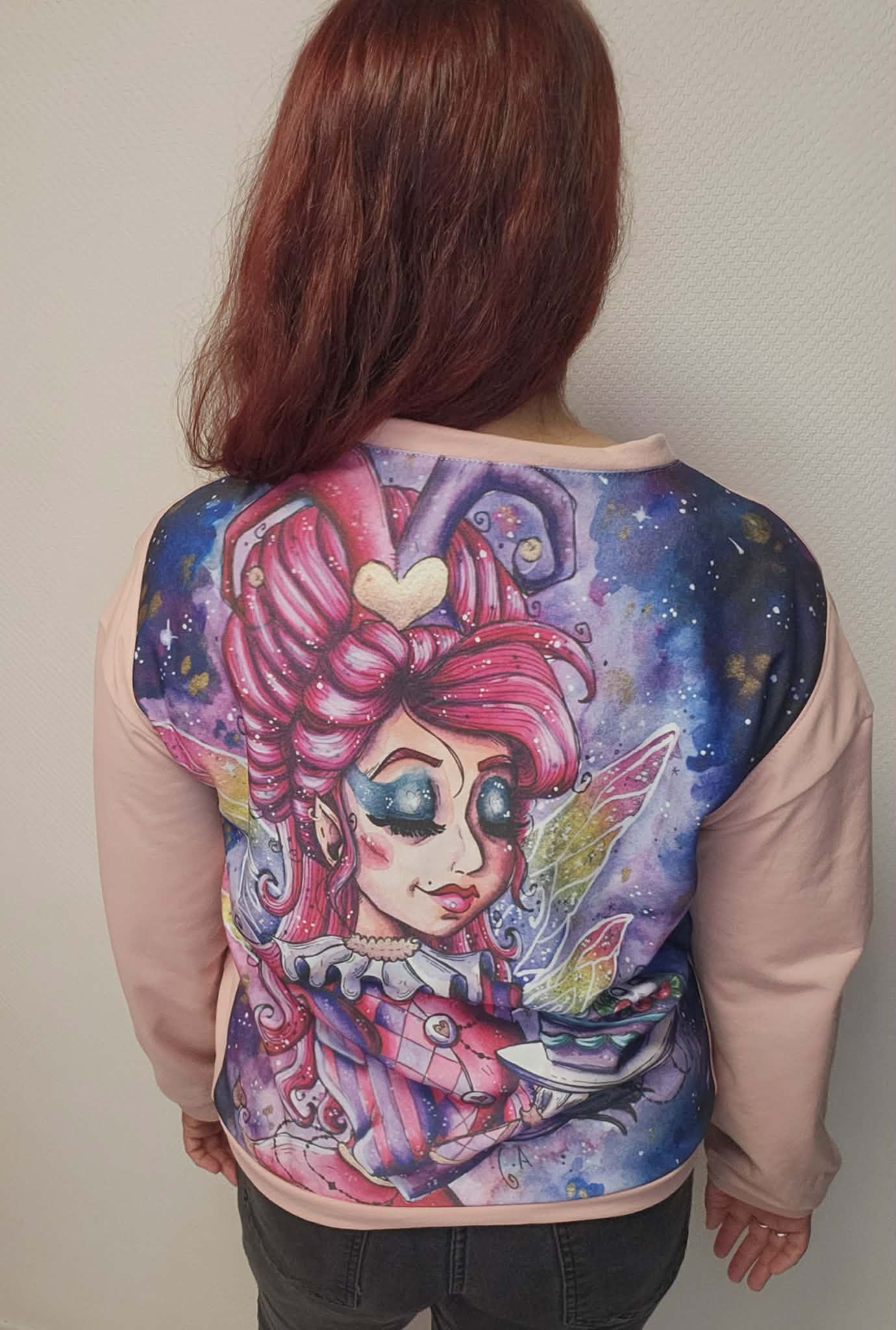 L’illustration est imprimée au dos du sweat sur un tissu french terry épais de 380 g/m², offrant un tombé structuré et une très belle qualité. La coupe se distingue par des manches légèrement bouffantes et une taille ajustée, pour une silhouette féminine et moderne.